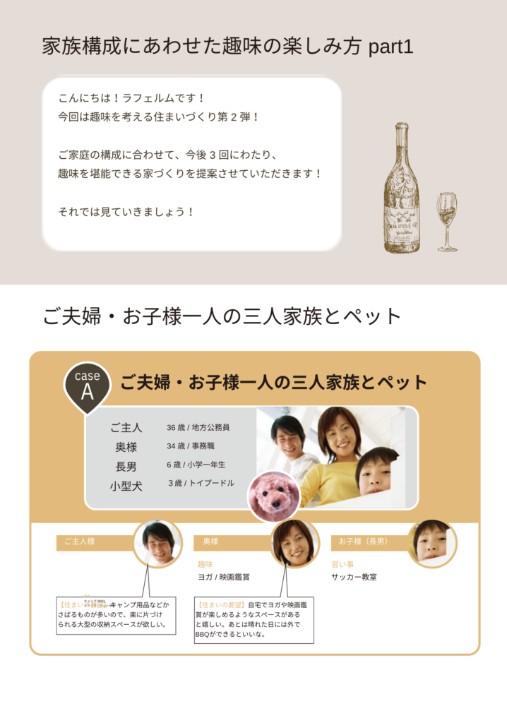 主人様の趣味は、キャンプ。奥様は映画鑑賞とヨガ。長男様はサッカー教室にかよってます。