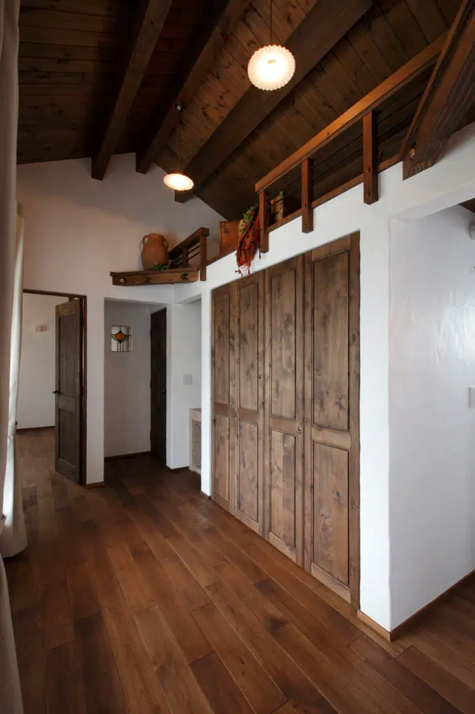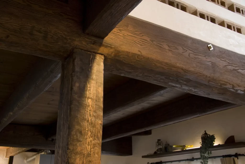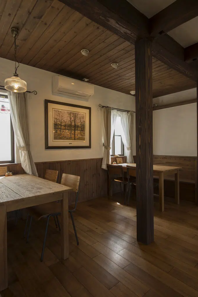 ヴィンテージ加工と塗装を施した落ち着いた色合いの柱や床、天井の梁。新築なのに、まるで何十年も昔からそこに在ったかのような落ち着いた佇まいです。