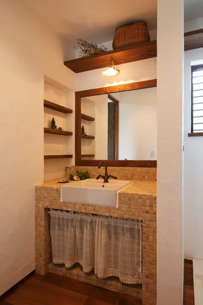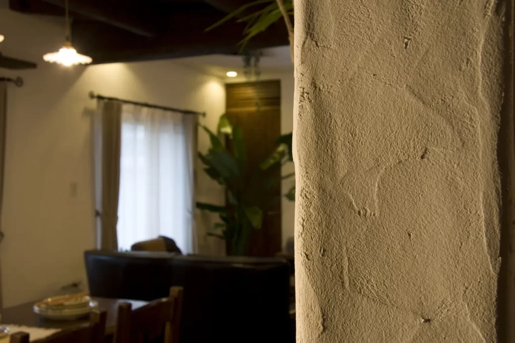 また、凸凹のある表情豊かな漆喰の塗り壁。手作り感のあるぬくもりあふれる壁は、照明の明かりに照らされることで表情豊かに空間を彩ります。